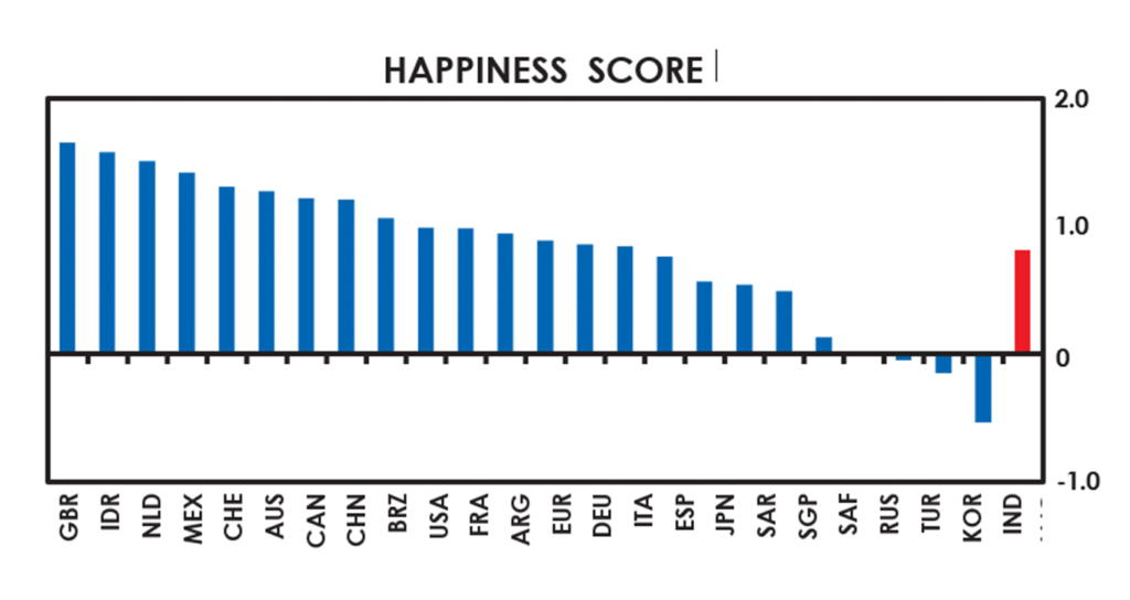 The happiness readings are shown below for all 24 major countries. The UK, Indonesia, Netherlands, Mexico, and Switzerland score highest on happiness, which includes measures like surveyed happiness and low suicide rates. China rates as happier than the US.