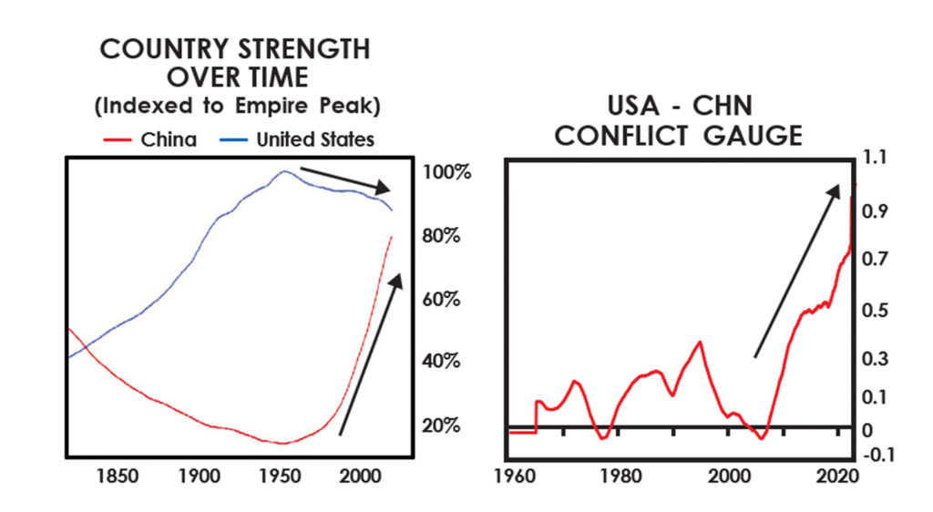 2. The international great power conflict risk appears to be the second greatest risk so I put it second. My measures show that the United States and China continue to be the two most powerful countries with high levels of conflict between them. As shown in the chart to the left, the United States is measured as a bit stronger with China rising fast, and the chart on the right shows that the conflict between them is the highest on record.