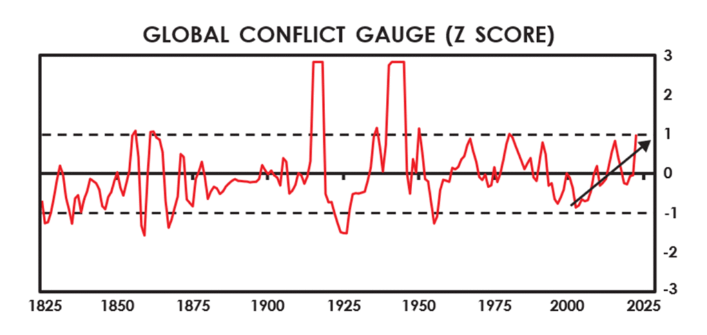 The U.S.-China conflict is only a part of the growing world conflict that are reflected in the sides lining up in allied and axis powers. The next chart shows our global conflict gauge. It includes all countries and goes back to 1825. As shown, it is at moderately high levels vs history, comparable to the highest levels except World Wars 1 and 2. It reflects both a high death toll and flow of refugees from ongoing conflicts in Ukraine and Gaza, and increased military spending.