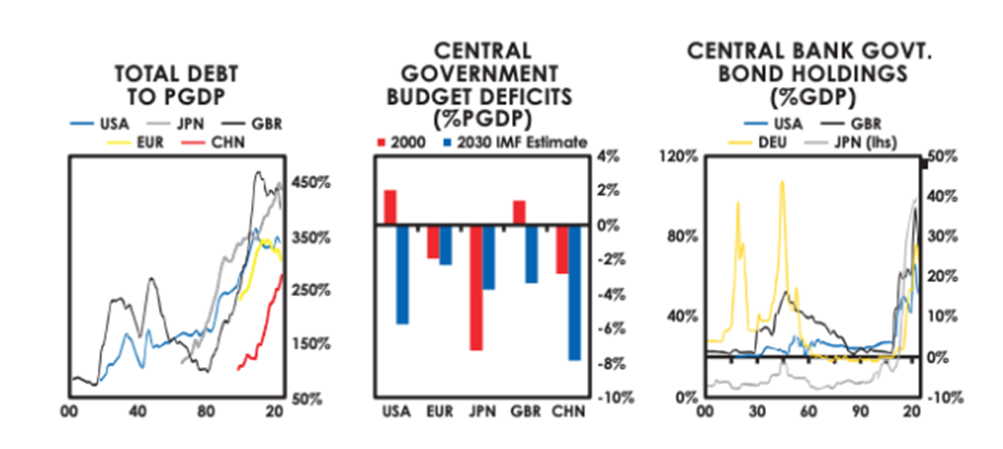 3. In terms of the debt/money/economy force, all major governments are today more indebted than at any time since the end of World War 2, with large deficits and projected debt increases ahead, and central banks holding the greatest amount of government debt since World War 2, due to inadequate private sector demand for government debt. See the chart on left for debt levels. See the chart in the middle for projected budget deficits. Thus far, much of the debt has been absorbed by the central banks of each country (see chart on the right), with significant increases following the global financial crisis and the covid crash.