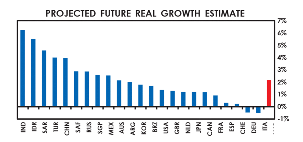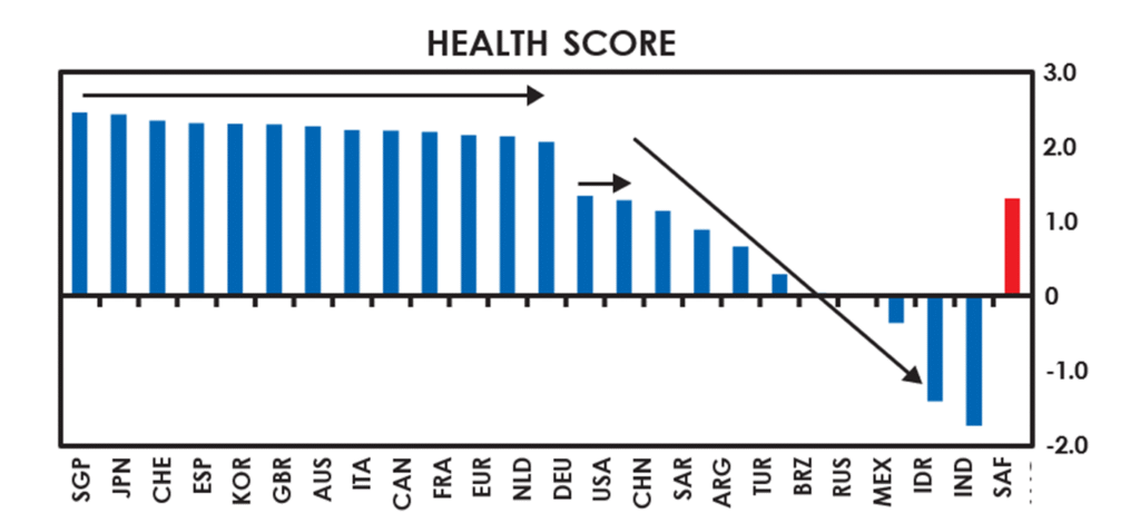 The Great Powers Index is very thorough report on each of the leading 24 countries, showing readings for several different categories of well-being with many measures of each category. It also uses these measures to provide a prognosis for the next ten years’ growth rates.