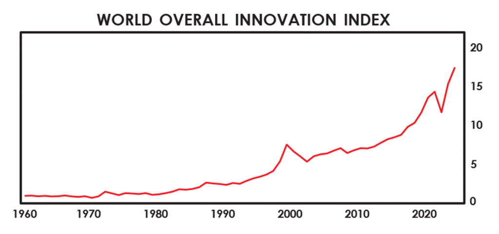 5. As for the fifth force, inventiveness especially of technological advancements to raise productivity & living standards, is the greatest force of humanity. Revolutionary new technologies like AI have the potential to greatly raise understanding and productivity in virtually every activity or damage mankind if not handled well. My measure of that force of innovation is shown in the chart below. As shown and one can clearly see in developments such as AI, it is accelerating